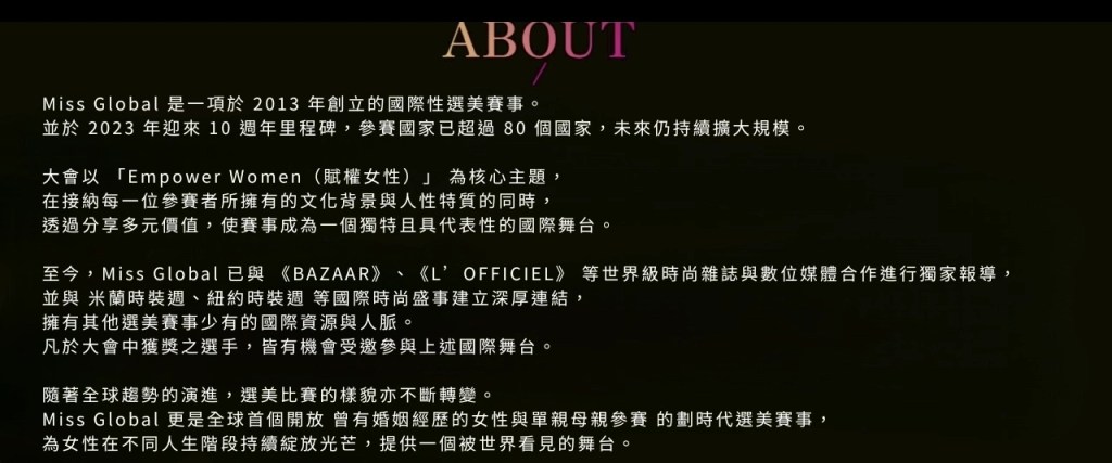 Miss Global 以 “Empower Women(賦權女性)” 為核心理念,致力於打造一個尊重多元文化、包容不同背景、展現女性力量的國際舞台。