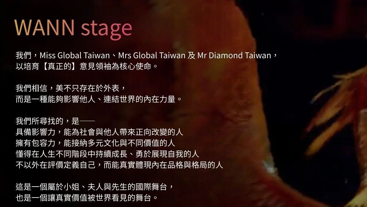 WANN STAGE 為旺愛國際文化藝術協會所建立的國際舞台平台,致力於整合選美舞台、文化藝術與國際交流。